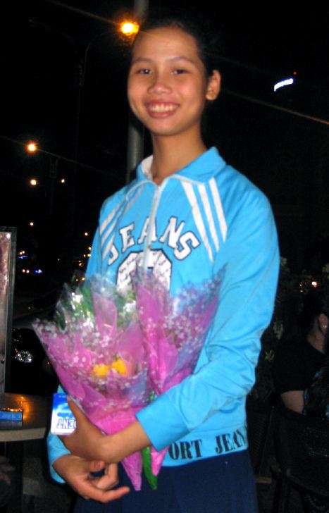 She is a 15-year old girl who goes to school in the morning and sells flowers at night. She lives with her aunt who gives her ten bouquets every night. And she can’t return home until she sells them all. It can take her anywhere from two to six hours to sell all ten bouquets, depending on the day of the week and time of the year. The price of USD1 per bouquet doesn’t make it any easier. She goes to the road-side restaurants and coffee shops around the Cathedral in HCMC (Ho Chi Minh City), where she can find foreigners who are usually better customers.