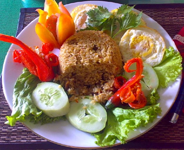 [Photo of Nasi Goreng from Indonesia – white fried rice mixed with meat or vegetable, usually served with a fried egg and some salad]