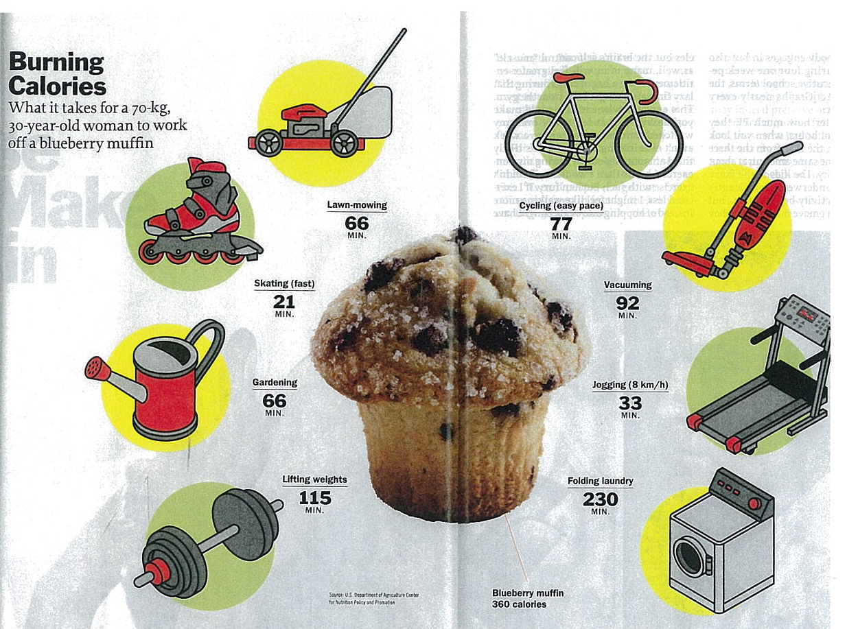 What it takes for a 70-kg, 30-year-old woman to work off a blueberry muffin (360 calories):